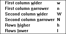 These menu items or alternatively the keys n,w,N,W,l,h allow to change the sizes of the two columns in the Management window as described by the following diagram:
